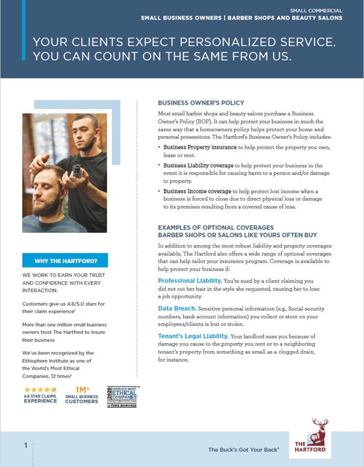 Most small barber shops and beauty salons purchase a Business Owner’s Policy (BOP). It can help protect your business in much the same way that a homeowners policy helps protect your home and personal possessions. The Hartford’s Business Owner’s Policy includes: