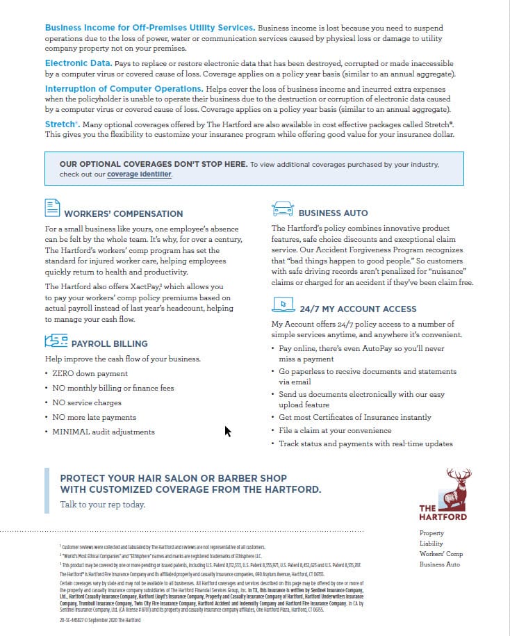 In addition to among the most robust liability and property coverages available, The Hartford also offers a wide range of optional coverages that can help tailor your insurance program. Coverage is available to help protect your business if: Professional Liability. You’re sued by a client claiming you did not cut her hair in the style she requested, causing her to lose a job opportunity. Data Breach. Sensitive personal information (e.g., Social security numbers, bank account information) you collect or store on your employees/clients is lost or stolen. Tenant’s Legal Liability. Your landlord sues you because of damage you cause to the property you rent or to a neighboring tenant’s property from something as small as a clogged drain for instance.